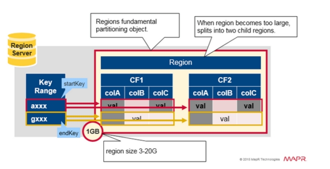Initially there is one region per table. When a region grows too large, it splits into two child regions.